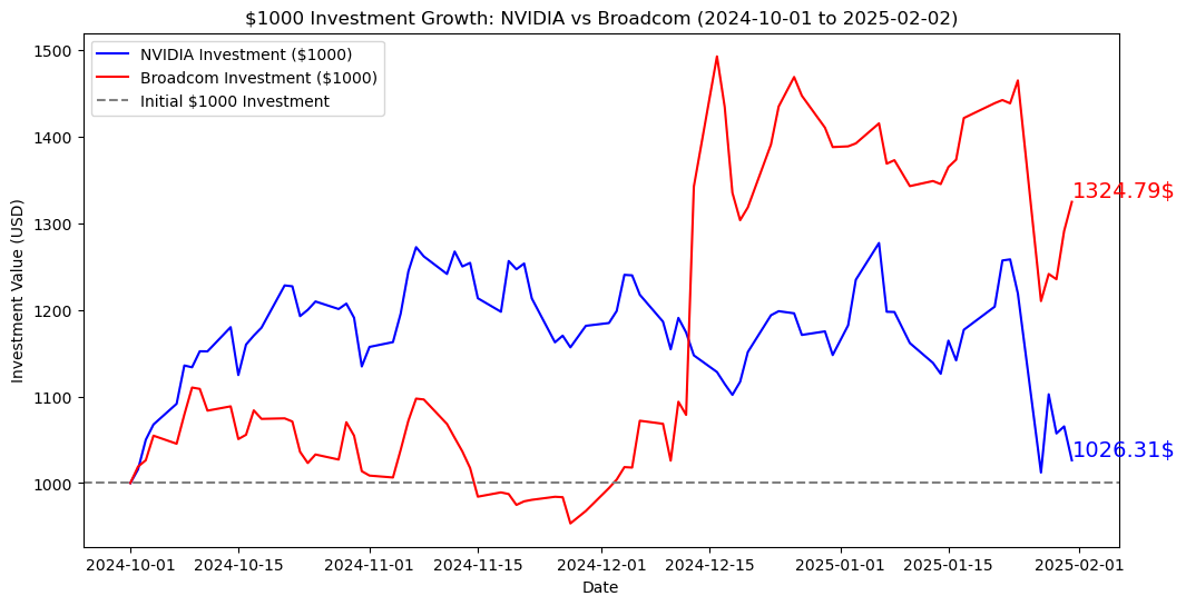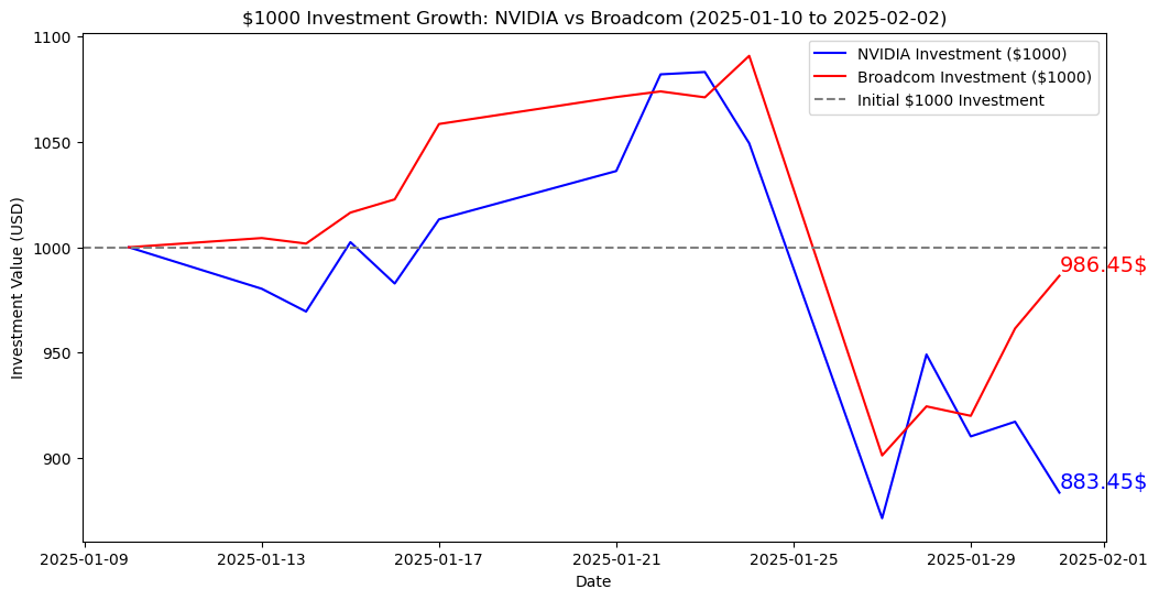 엔비디아와 브로드컴 최근 주식(차트) 비교 - 1000$ 시뮬레이션